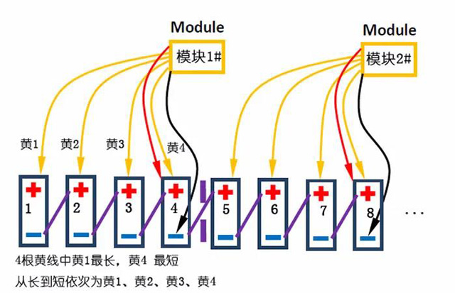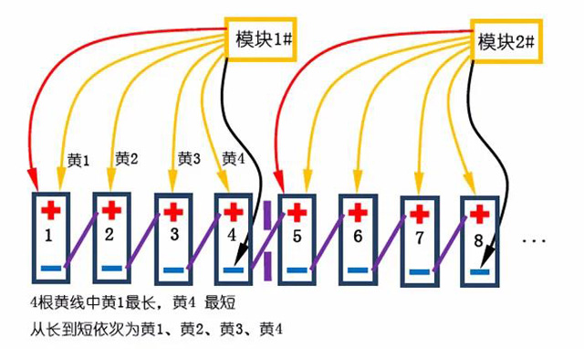 2.針對2V單體,可能出現電壓不滿足的情況,將臨近4節單體,按照4節單體法連接,重復的黃線不連接(紅黑線間4節單體)