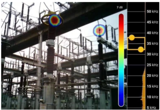 高壓電氣設備發生局部放電時,會產生超聲波能量,這些能量通過空氣傳遞至聲學成像儀的聲壓傳感器陣列,在顯示屏上以可見光圖像為底、超聲波能量按照調色板顏色顯示的畫面,從圖像上即可快速對局部放電部位進行排查,并可將局部放電的問題點以JEPG照片或MP4視頻格式進行保存。