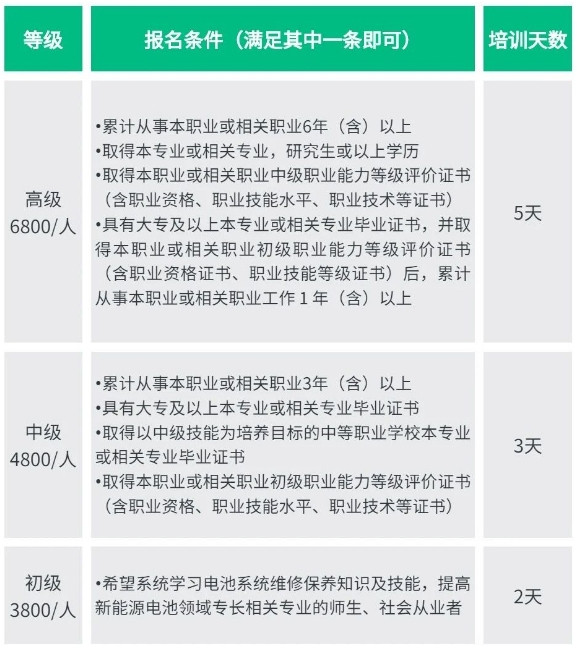 考核通過的學(xué)員將獲得工業(yè)和信息化部教育與考試中心頒發(fā)的“電池維修保養(yǎng)”(初、中、高級)職業(yè)技術(shù)證書,為新能源汽車電池維修及保養(yǎng)等相關(guān)崗位儲備和推薦優(yōu)秀人才,拓展學(xué)員職業(yè)規(guī)劃領(lǐng)域,提升個人職業(yè)發(fā)展能力。