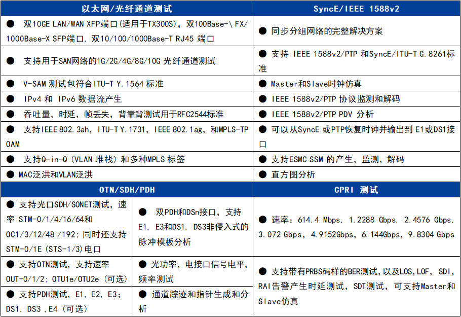 TX300S是一款便攜式OTN/SDH/SONET/PDH/DSn以太網和同步分組網絡測試儀,全面滿足傳統功能測試的同時,還可以支持基于移動回程技術的SyncE,1588PTPv2,電信級以太網和CPRI測試功能。