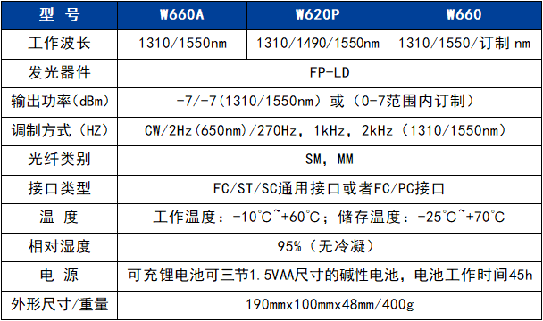 W660系列手持式激光光源安裝有1~2個激光器,可發出1~4個波長的穩定激光。支持連續波和調制波輸出、具有自動關機、單鍵切換波長、提供650nm可見紅光,電池低電壓檢測等實用功能,并可向單模光纖提供1310nm和1550nm的雙向波長激光輸出,廣泛用于光纖網絡領域的安裝、運營和維護工作。