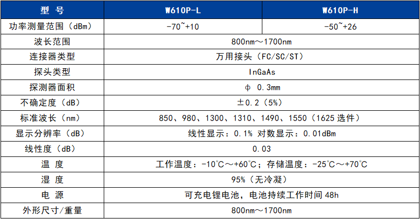 W610 系列光功率計不同款式能滿足不同需求。具有靈巧的外形、友好的操作界面、超寬的測試量程、精準的測試精度、高亮背光LCD顯示等特色,以及全新的自校準功能等眾多優點。人性化設計,更有一體化的防震護套,全面滿足您的測試需要,是光纖網絡精準測試的理想選擇。