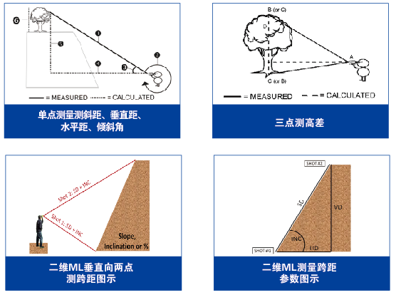 ● 具有單點測距測角、單點測垂直相對高度、兩點測跨距、三點測高等操作功能