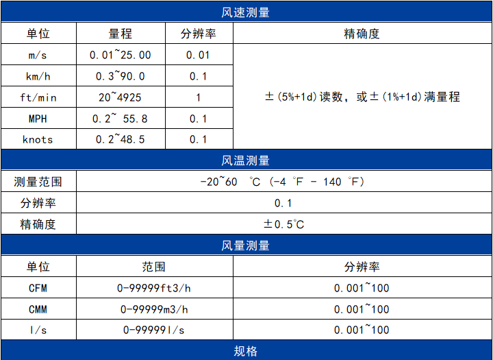 ● 多種功能風(fēng)速:m/s,km/h,ft/min,MPH,Knots;